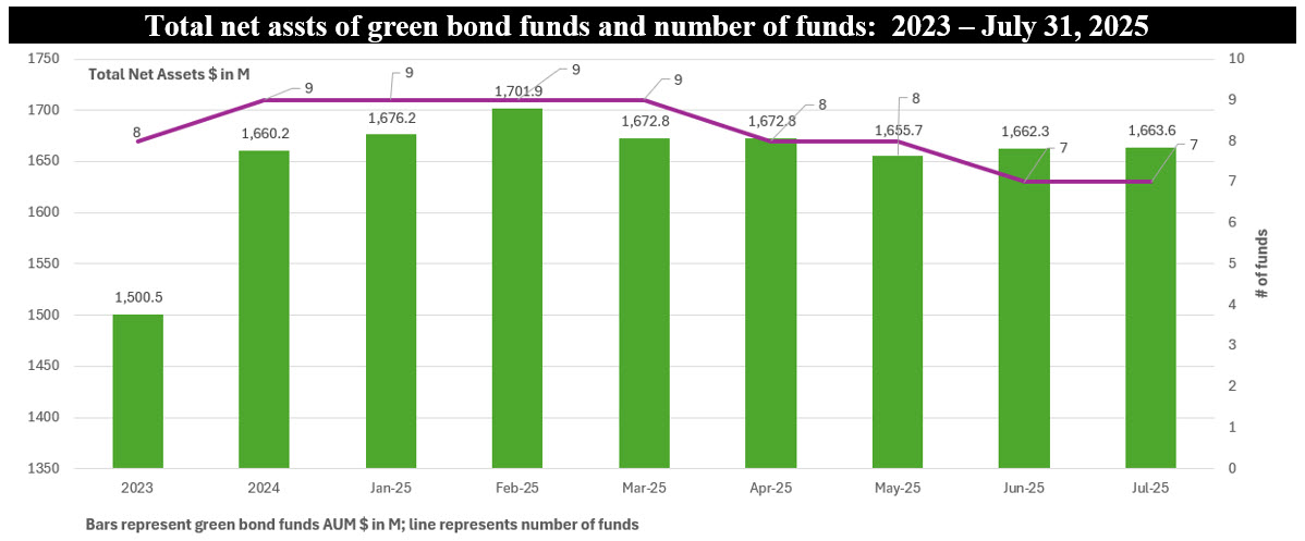 • The latest liquidation of a green bond fund, which occurred as of June 25, 2025, involved the $32.4 million Mirova Global Green Bond Fund with its three share classes. The fund’s investors were dominated by institutional investors that accounted for $19.2 million or 59% of the fund’s assets. Previously, in April of the year, Lord Abbett liquidated the $5.6 million Lord Abbett Climate Focused Bond Fund. The fund, with its five share classes, couldn’t seem to achieve traction. That said, assets attributable to the green bonds segment have remained stable this year, averaging some $1.7 billion throughout 2025, due in part to a large institutional shareholder base that accounts for a minimum of 51% of assets.